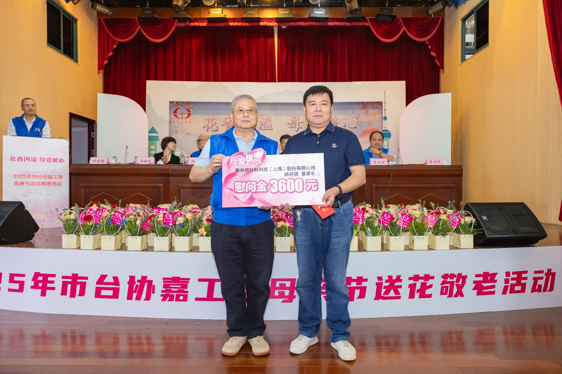 5 月 11 日上午,惠柏新材董事长杨裕镜先生代表公司受邀出席“花香四溢 母爱暖心” 上海市台协嘉定工委会母亲节送花敬老活动。活动现场,杨裕镜先生亲手为老人们献上精心制作的花束,不仅承载着对“老吾老以及人之老”传统美德的传承,更传递着企业对老年群体的关怀。与此同时,惠柏新材还向福利院捐赠了慰问金,用切实的物资支持为老人们的生活增添温暖保障。